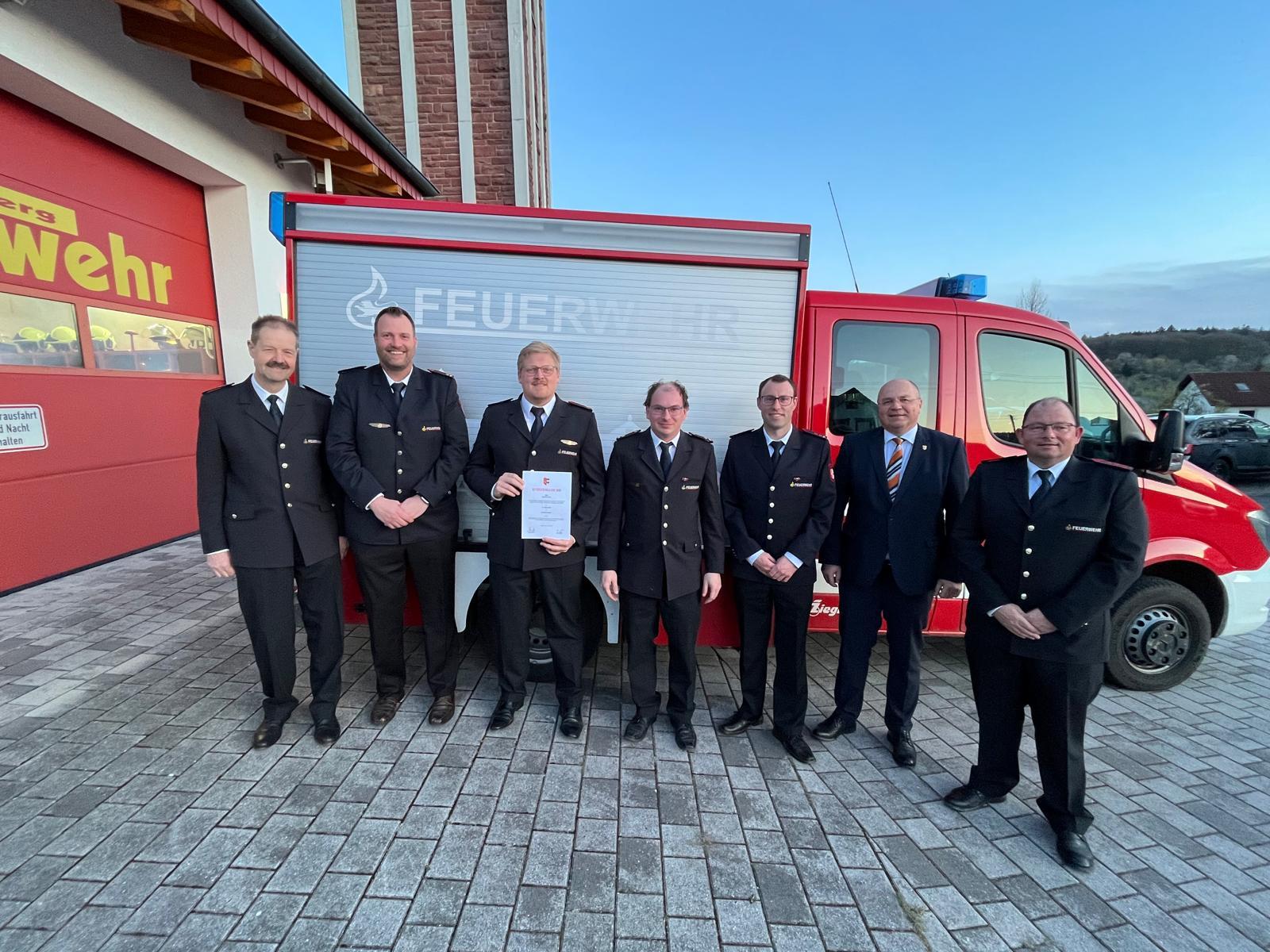 Bürgermeister Thorsten Weber, stv. Kommandant Josef Bangert, Kommandant Karl Wendel, Lydia Ebermann, Marc Gramlich, Jan Strunze, Alexander Schiller, Finn Strunze und Aaron Knecht