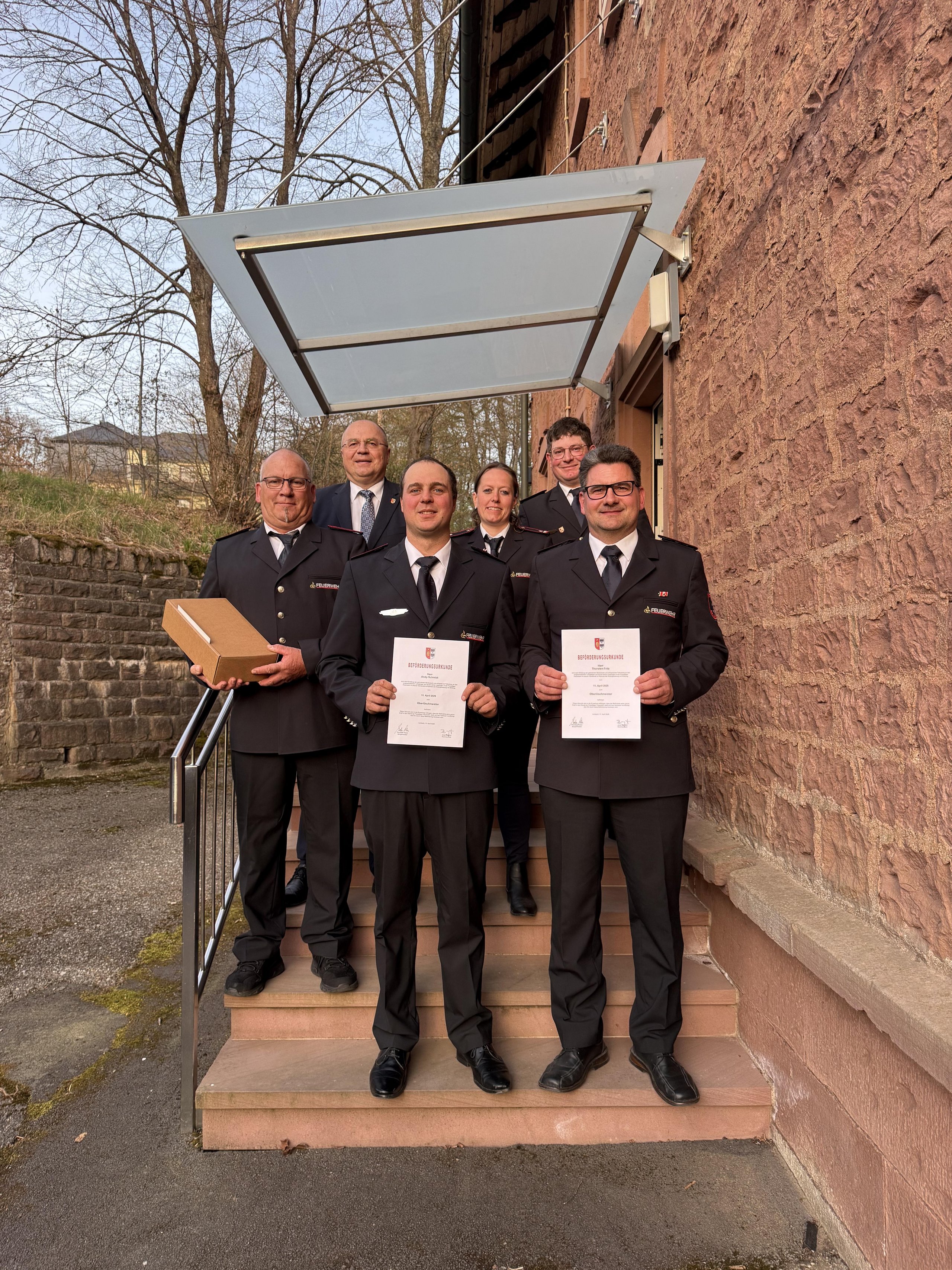 Florian Roos und Thomas Zimmermann wurden auf Grund ihrer Amtszeit als Kommandanten zum Oberlöschmeister befördert. Markus Ihrig hat seine Ausbildung zum Zugführer an der Landes-Feuerwehrschule abgeschlossen und erhält die Beförderung zum Brandmeister.